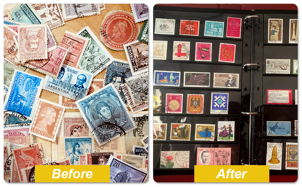 - 【Stamp pages for collectors】-stamp holder can be a nice gift for family members, friends, colleagues, neighbors and more, which can be applied for collecting stamps, postcards, banknotes, invoices, paint samples, movie tickets, and more, to help you organize your collections in an easy and pleasant way