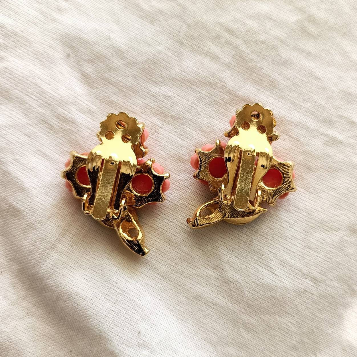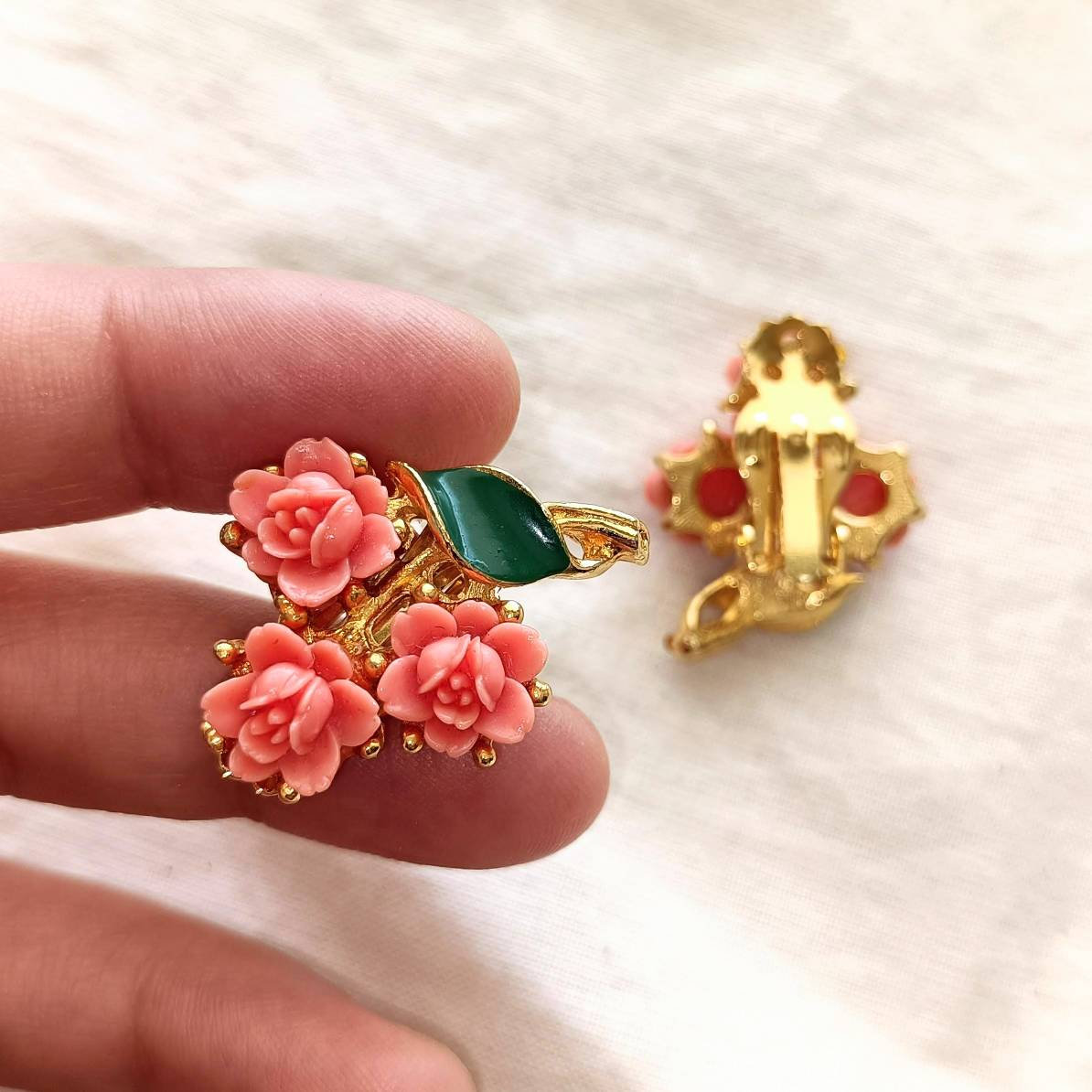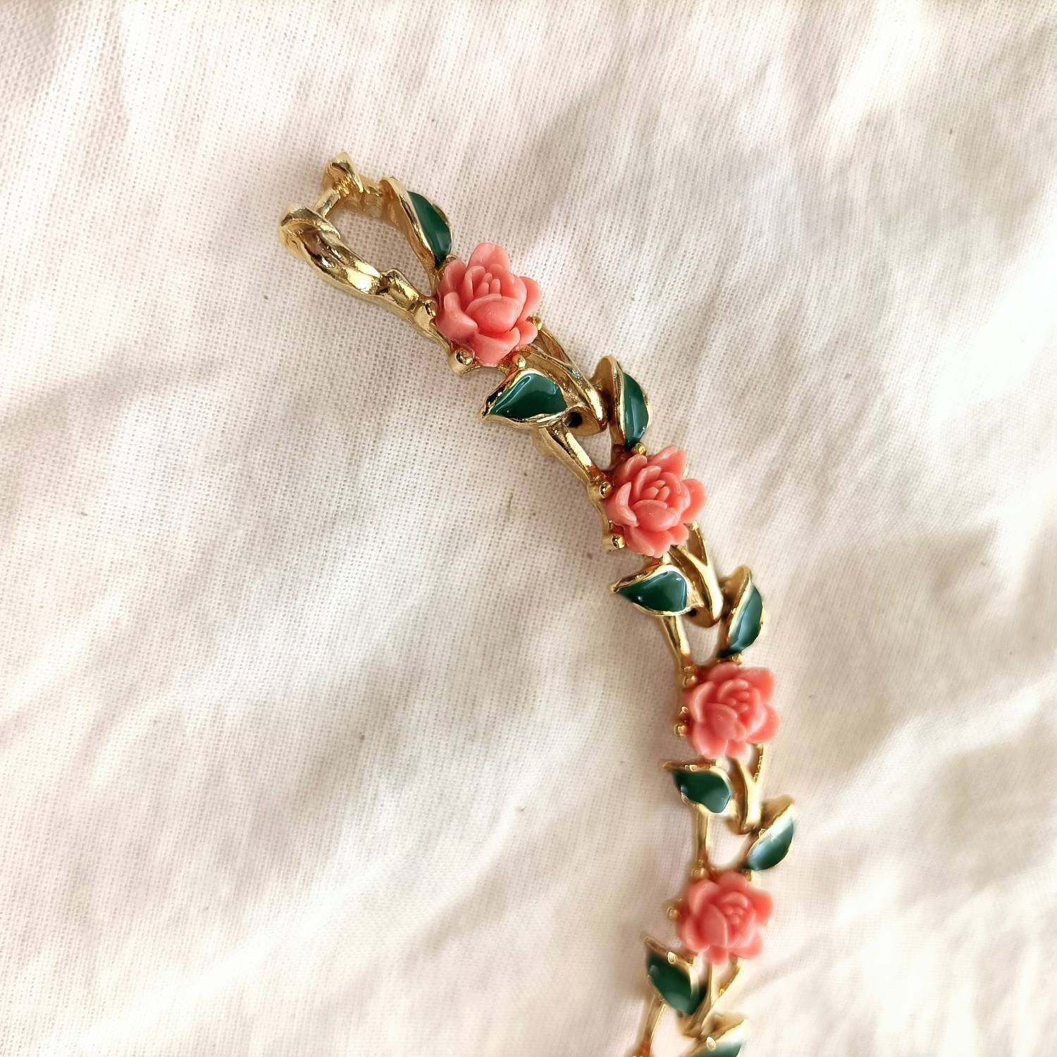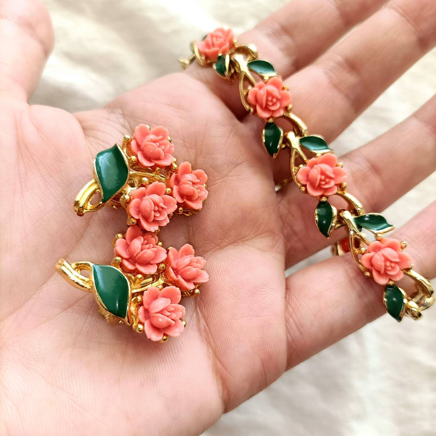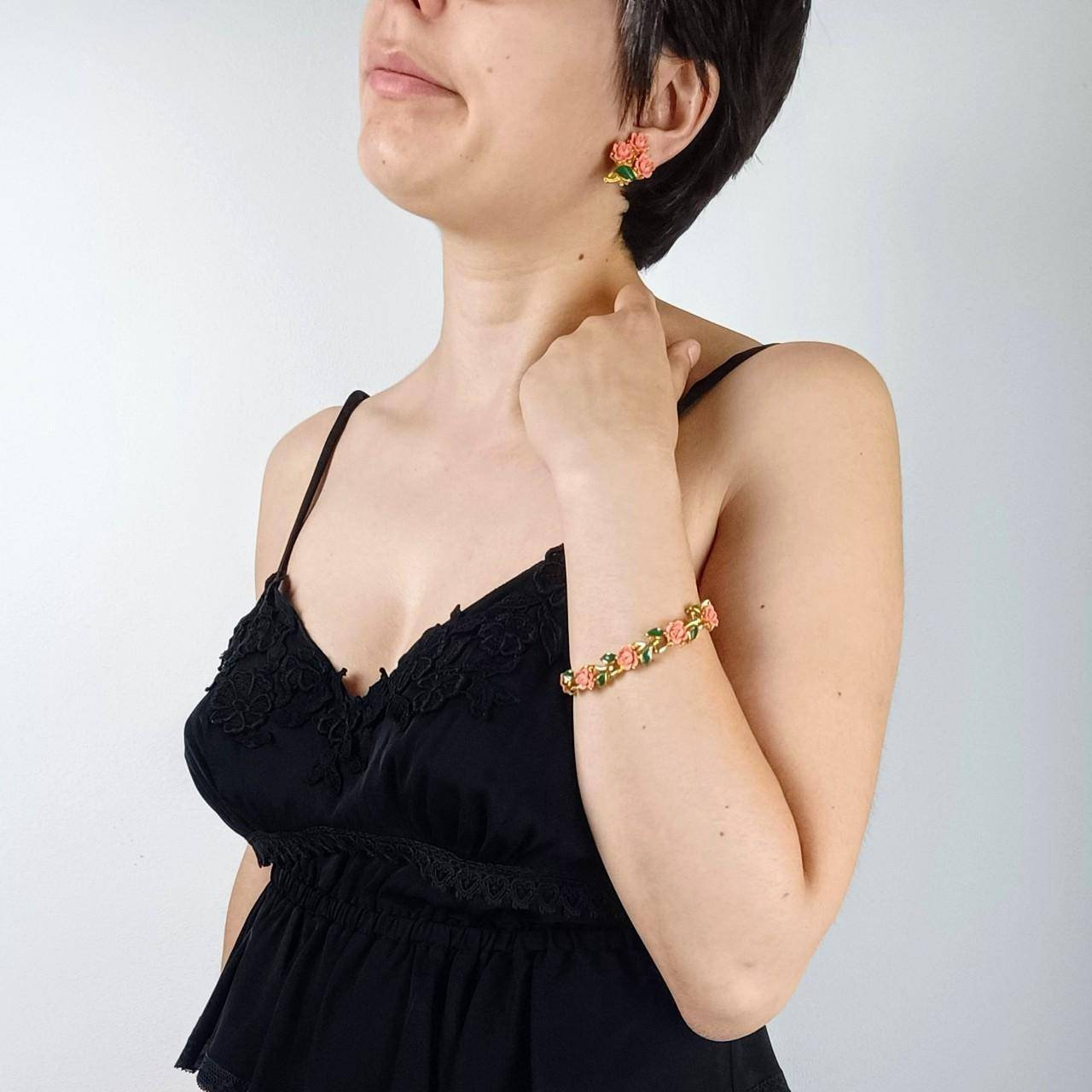 Vintage floral demi parure with an intertwining of roses on the bracelet, taken up in the clip earrings. In gold-plated metal, the flowers are made of resin or synthetic material while the green leaves are enameled.